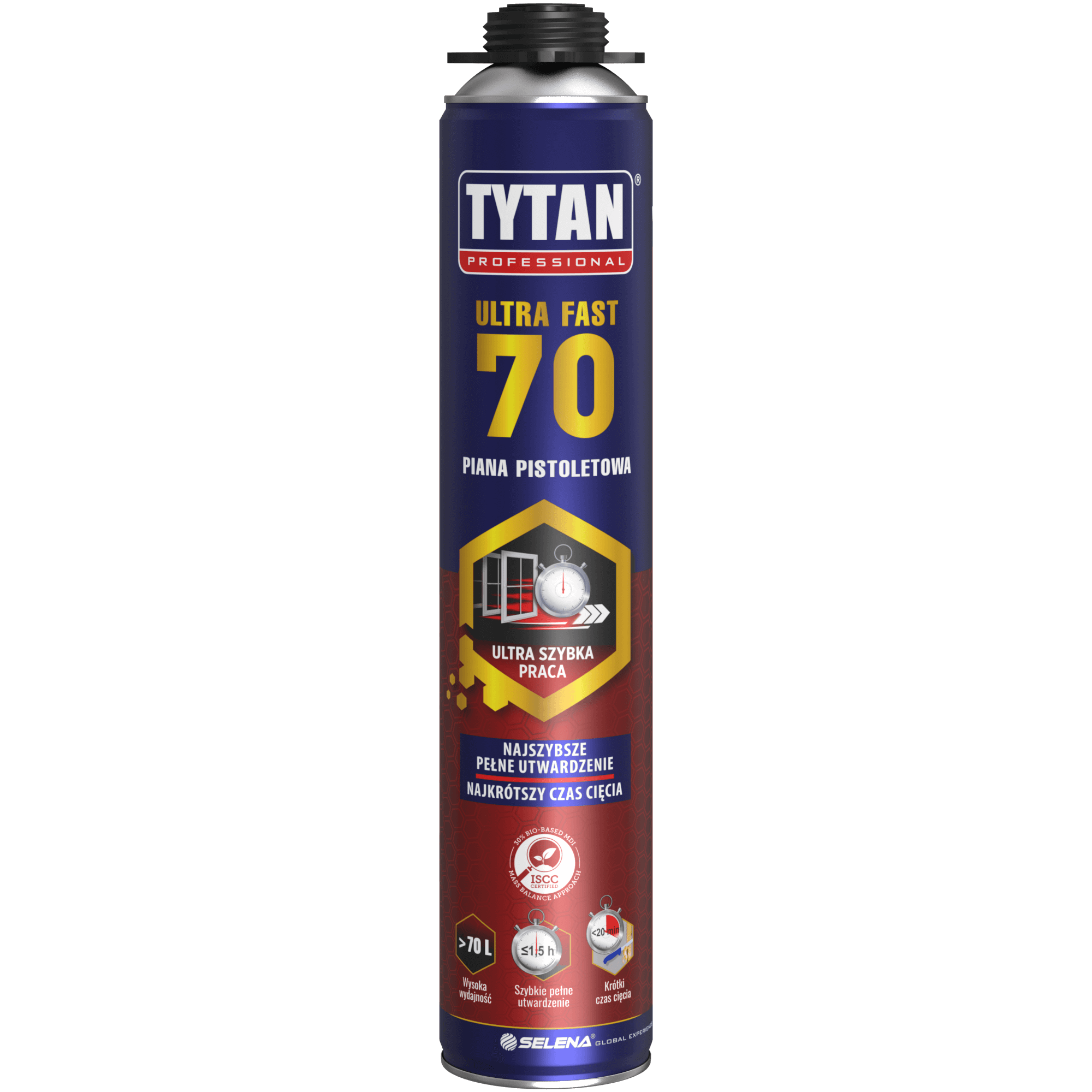 Piana pistoletowa Tytan Professional ULTRA FAST 70 charakteryzuje się wysoką wydajnością do 77 litrów oraz niską post ekspansją. Nowoczesna formuła umożliwia wstępną obróbkę po niecałych 20 minutach. Po 1,5 h pełne utwardzenie piany pozwala przejść do kolejnych etapów montażowych. Jednolita struktura zapewnia bardzo wysoką izolacyjność akustyczną do 63 dB i termiczną. Piana jest odporna na pleśnie i grzyby oraz na działanie wysokich i niskich temperatur.