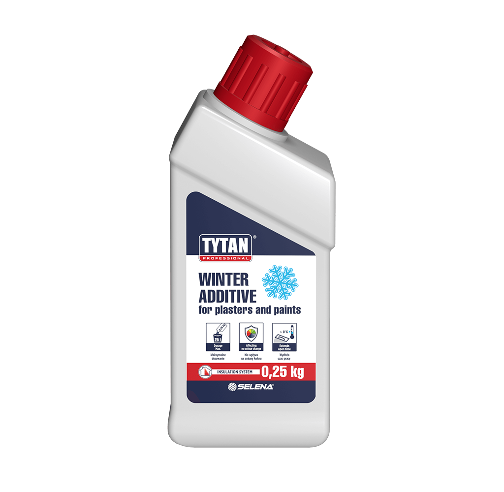 Dodatek zimowy do tynków i farb umożliwia prowadzenie prac ociepleniowych z wykorzystaniem tynków i farb fasadowych w warunkach niskich temperatur, tj. od 0°C do +10°C i podwyższonej wilgotności powietrza do 80%. Jest bezbarwną cieczą, która może być dodawana do tynków akrylowych, zolokrzemowych i silikonowych oraz do fasadowych farb akrylowych, zolokrzemowych i silikonowych. Produkt chroni przed działaniem obniżonych temperatur, wpływając na szybsze rozpoczęcie wiązania i wysychania spoiwa. Dodanie środka nie powoduje zmiany kolorystyki tynku czy farby. Nie obniża wytrzymałości powłoki wykończeniowej i sprawia, że osiąga ona znacznie szybciej odporność na działanie niekorzystnych czynników atmosferycznych. Jego szybkość działania jest uzależniona od temperatury i wilgotności otoczenia.