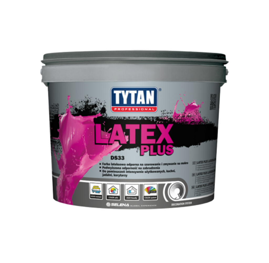Farba lateksowa LATEX PLUS przeznaczona jest do wymalowań pierwotnych i renowacyjnych wszystkich wysezonowanych podłoży mineralnych tj.: tynki gipsowe, cementowe, cementowo-wapienne, wapienne, cienkowarstwowe tynki mineralne i akrylowe, beton, płyty gipsowo-kartonowe. Szczególnie zalecana do malowania ścian i sufitów w pomieszczeniach intensywnie użytkowanych takich jak kuchnie i jadalnie, pomieszczenia restauracyjne, biurowe oraz wszędzie tam, gdzie wymagana jest najwyższa odporność na zmywanie i szorowanie. Ma bardzo dobre właściwości kryjące. Tworzy matową lub półmatową gładką powłokę bez spękań, odporną na zmywanie i szorowanie. Podczas aplikacji nie chlapie i nie pozostawia smug.