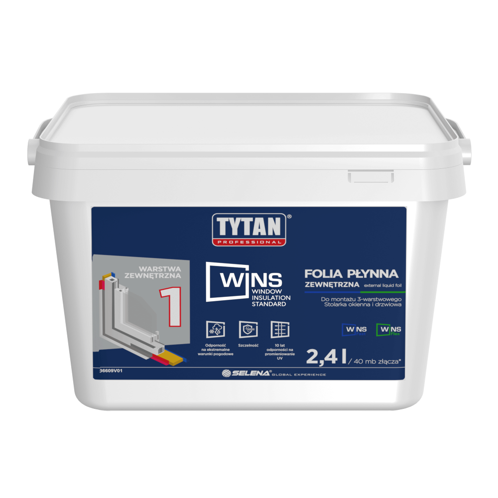 Folia płynna okienna Tytan Professional WINS zewnętrzna to jednoskładnikowa, gotowa do użycia powłoka, charakteryzująca się elastycznością i paroprzepuszczalnością. Zapobiega degradacji piany PU, regulując migrację wilgoci ze szczeliny okiennej na zewnątrz. Chemicznie neutralna, przylega do większości materiałów budowlanych. Idealna do uszczelniania złączy ościeżnic z ościeżami w systemach 3-warstwowych. W połączeniu z pianą Flex i folią płynną wewnętrzną tworzy odporne na wodę i wiatr połączenie o wysokiej efektywności energetycznej. Chroni przed wilgocią i grzybami. Odporna na ekstremalne warunki pogodowe i promieniowanie UV do 10 lat.