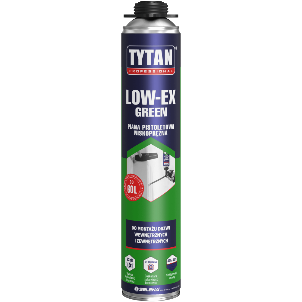 Wysokowydajna, niskoprężna piana pistoletowa, której receptura oparta jest częściowo o surowce pochodzące ze źródeł odnawialnych. Piana LOW-EX GREEN charakteryzuje się się wysoką wydajnością do 60 litrów oraz kontrolowanym, bardzo niskim przyrostem wtórnym.