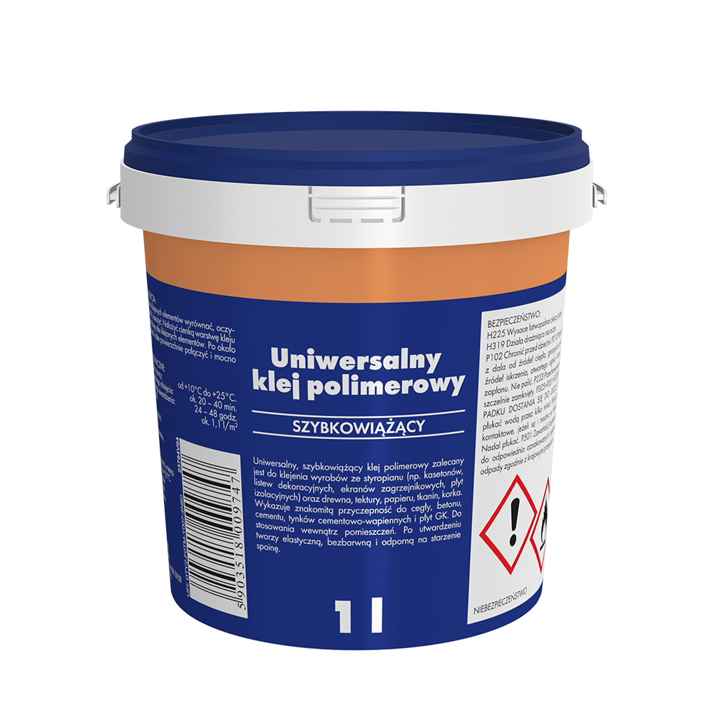 Klej polimerowy zalecany jest do klejenia wyrobów ze styropianu (np. kasetonów, listew dekoracyjnych, ekranów zagrzejnikowych, płyt izolacyjnych) oraz drewna, tektury, papieru, tkanin i korka. Wykazuje znakomitą przyczepność do cegły, betonu, cementu, tynków cementowo wapiennych i płyt G-K. Zalecany do stosowania wewnątrz pomieszczeń.