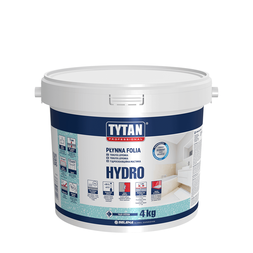 Płynna folia HYDRO jest gotowym jednoskładnikowym produktem przeznaczonym do wykonywania izolacji przeciwwilgociowych i wodochronnych, na powierzchniach narażonych na zawilgocenia lub czasowy kontakt z wodą. Przed przyklejeniem płytek ceramicznych, na powierzchniach narażonych na zawilgocenia lub czasowy kontakt z wodą. Tworzy szczelną i wysoko elastyczną powłokę mostkującą rysy podłoża oraz trwale uszczelniającą naroża pomieszczeń, szczeliny dylatacyjne i przejścia rur sanitarnych w połączeniu ze specjalnymi taśmami i kołnierzami uszczelniającymi z systemu hydroizolacji Tytan Professional.